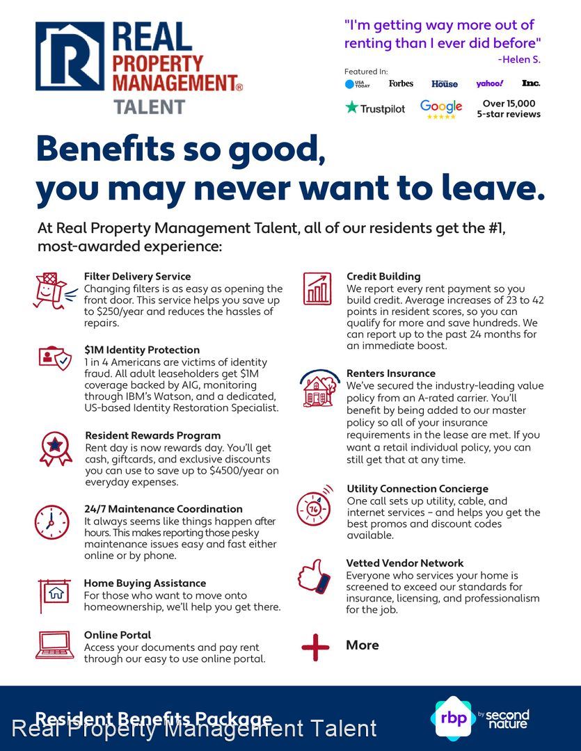 **All RPM Talent residents are enrolled in the Resident Benefits Package (RBP) for $50.95/month which includes renters insurance, HVAC air filter delivery (for applicable properties), credit building to help boost your credit score with timely rent payments, $1M Identity Protection, move-in concierge service making utility connection and home service setup a breeze during your move-in, our best-in-class resident rewards program, and much more! More details upon application.