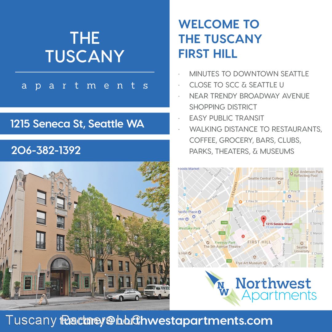The Classic and Historic Tuscany Apartments are located in the heart of First Hill. We are within blocks of Madison Street, Broadway Ave, and the Pike/Pine Corridor! Discover your favorite new restaurants, shops, groceries, music, art, and nightlife just minutes from your home! Near all major bus lines/routes. Are you a student? We are conveniently located nearby Seattle U and Seattle Central!